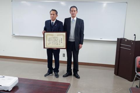 町村監査功労者表彰伝達(左・小林監査委員、右・朝生会長)