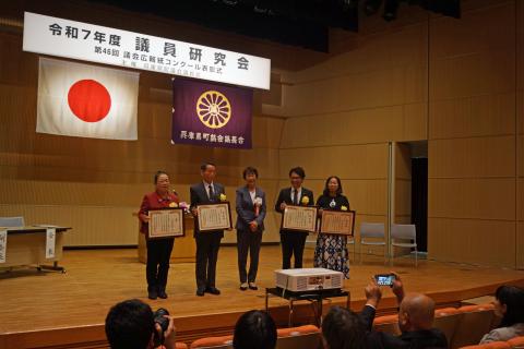 研究会に先立ち、第46回議会広報紙コンクール表彰式を開催し、広報委員会代表者に表彰状を授与いたしました。